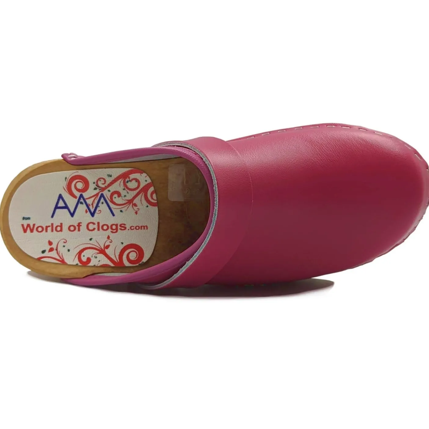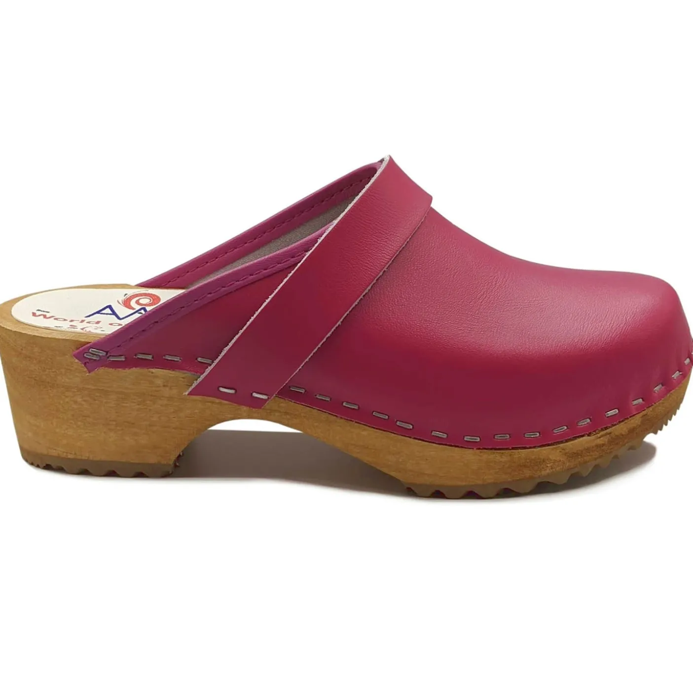 Traditional Swedish clogs with honey stained wooden footbeds, vibrant coated leather uppers and rubber grip soles.