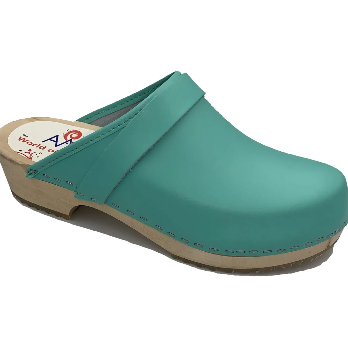 A Quality Unisex Swedish clog with natural wooden footbed, vibrant coloured leather uppers and rubber grip sole.