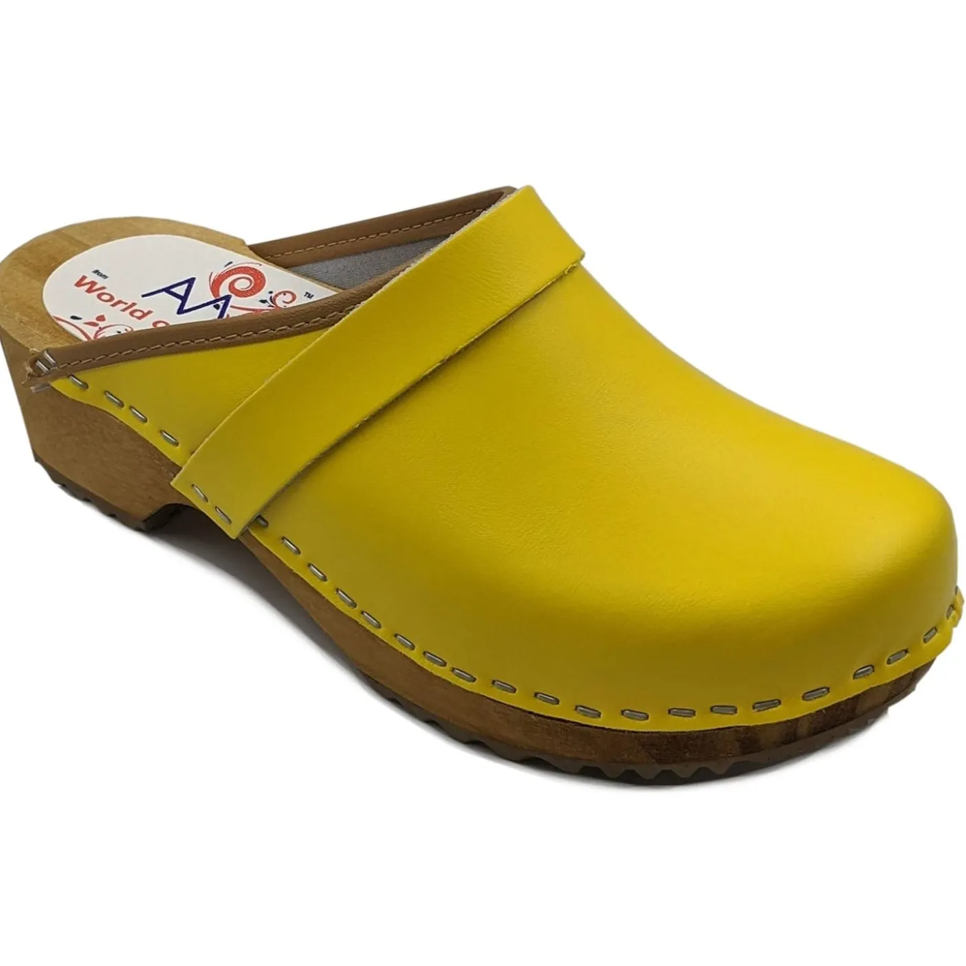 Traditional Swedish clogs with honey stained wooden footbeds, vibrant coated leather uppers and rubber grip soles.