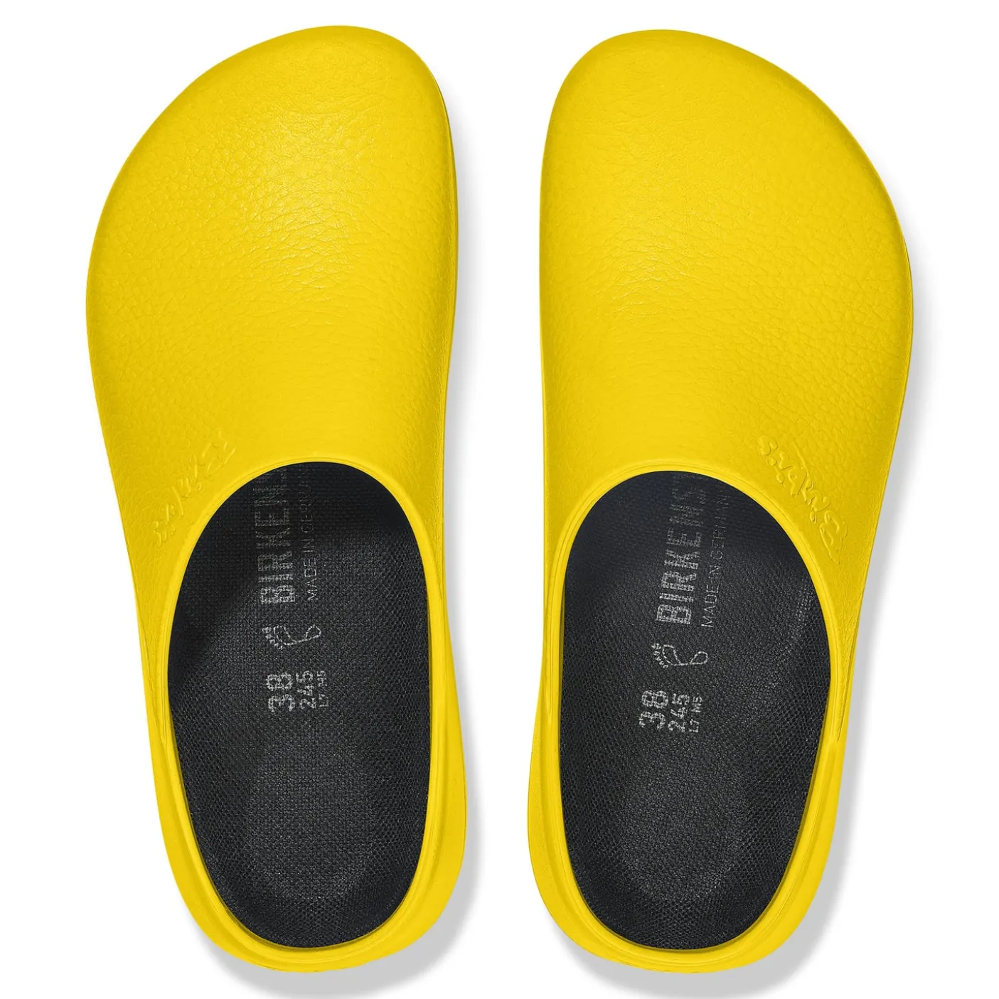 The Super Birki PU is the Birkenstock clog for professional wear. With a flat heel and seamless moulded design, this stable clog is water and dirt-resitant, super-grippy and skin-friendly.