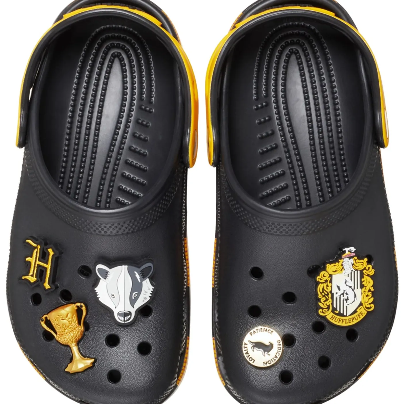 Harry Potter! Do what is nice with these Hufflepuff clogs. Classic clogs starring iconic Harry Potter graphics from the book and film series. Incredibly light and fun to wear. Heel strap for a more secure fit. Customisable with Jibbitz charms. Iconic Crocs Comfort cushioning.