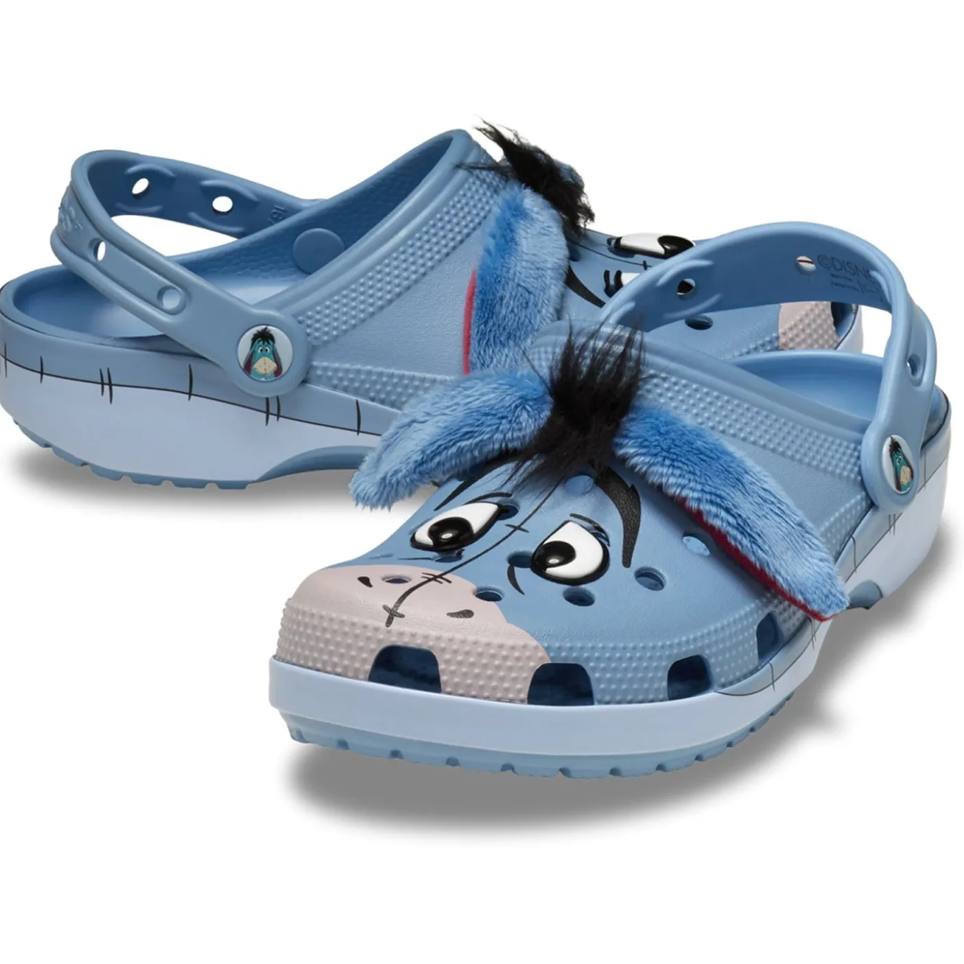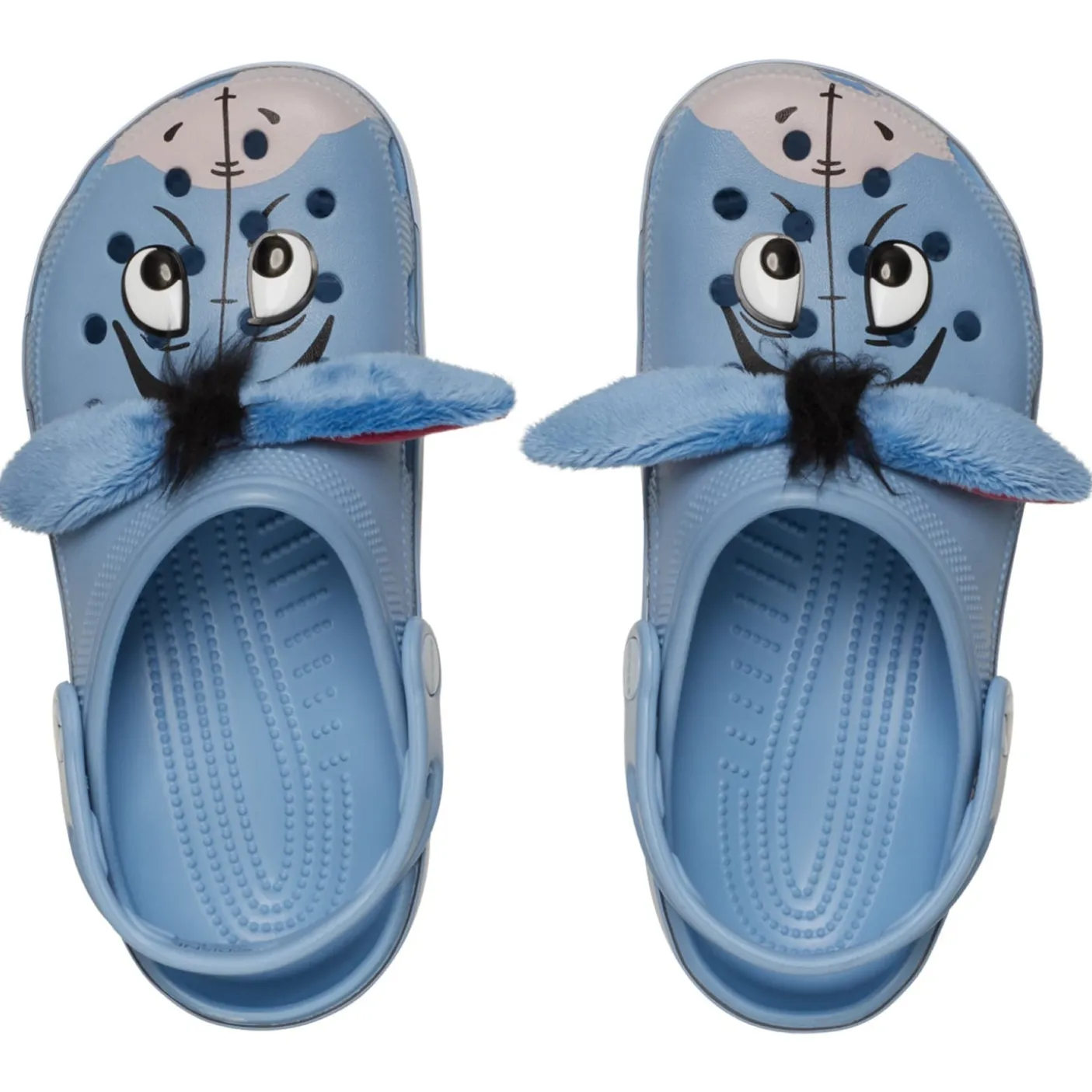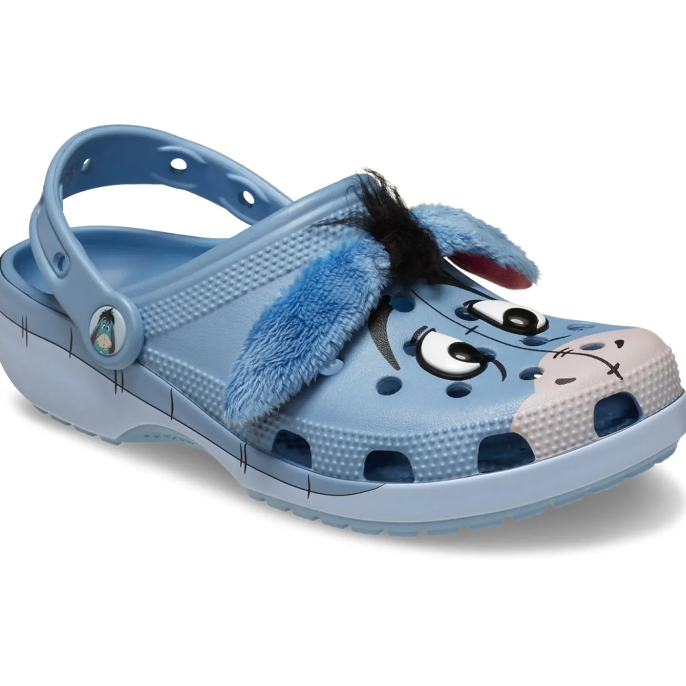 Moulded lighweight Croslite material construction with vents. Eeyore’s face is printed across the toe-box while a 3D adaptation of its hair and fuzzy ears are on the upper.