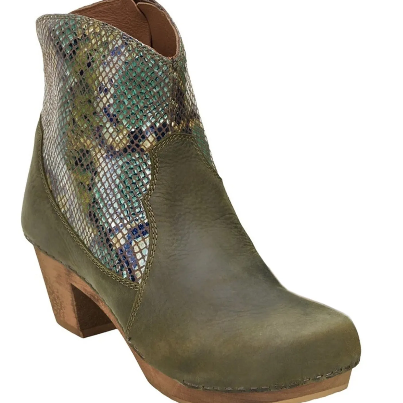 A fashionable medium high shaft boot in embossed and oil leather. Made with lime tree wooden and grippy soles. 6 cm heel height. From Danish makers Sanita.