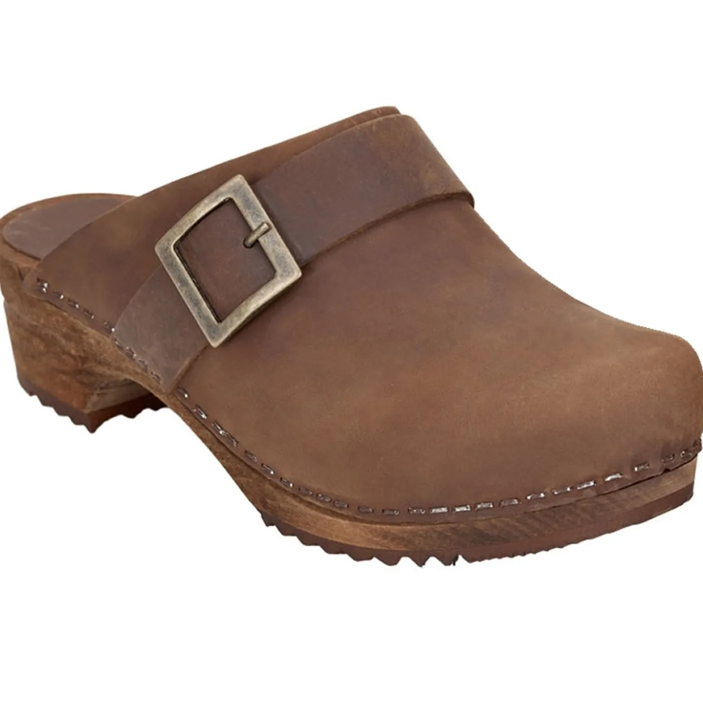 Ladies open wooden footbed clogs with large antiquated brass buckle.