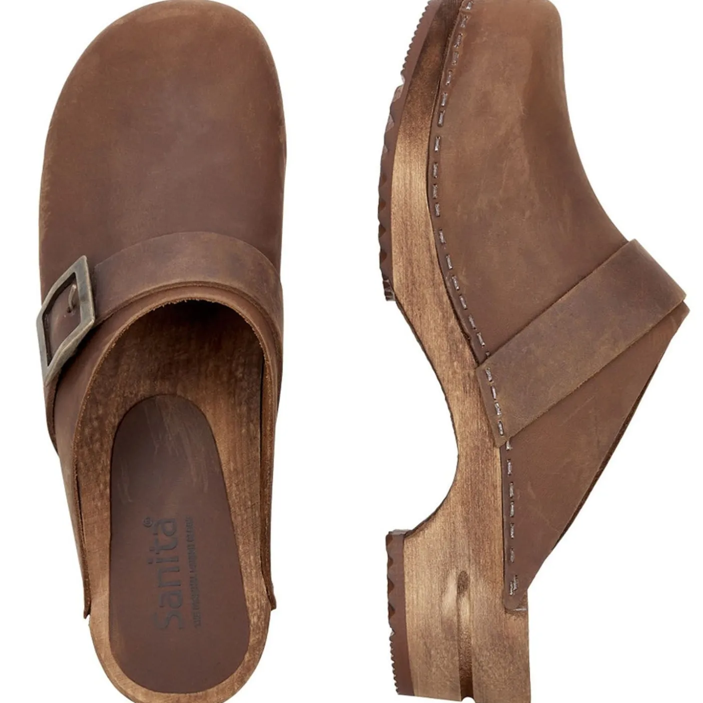 Stained antique brown footbeds. Dark leather uppers. Thick grippy soles. From Danish makers Sanita.