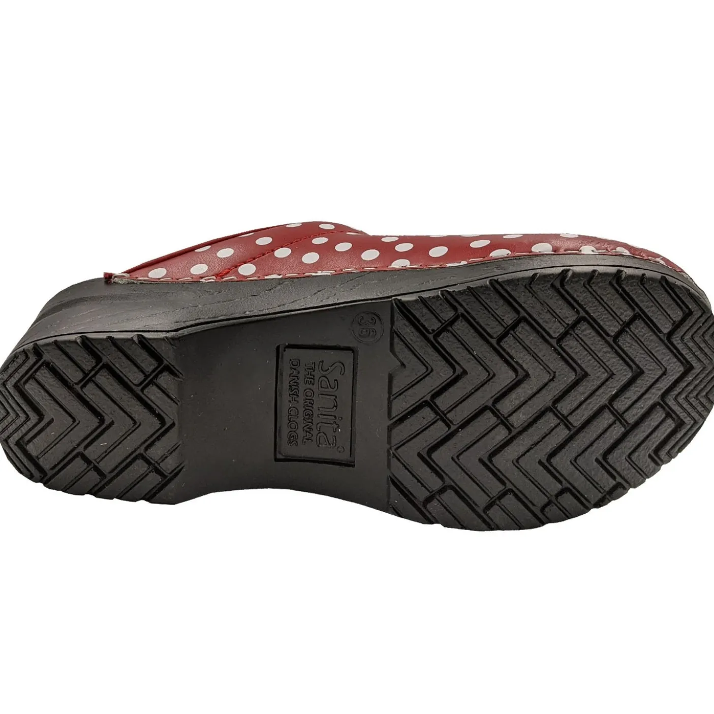 Ladies open flexible clogs with fun spotty wipe-clean leather uppers.