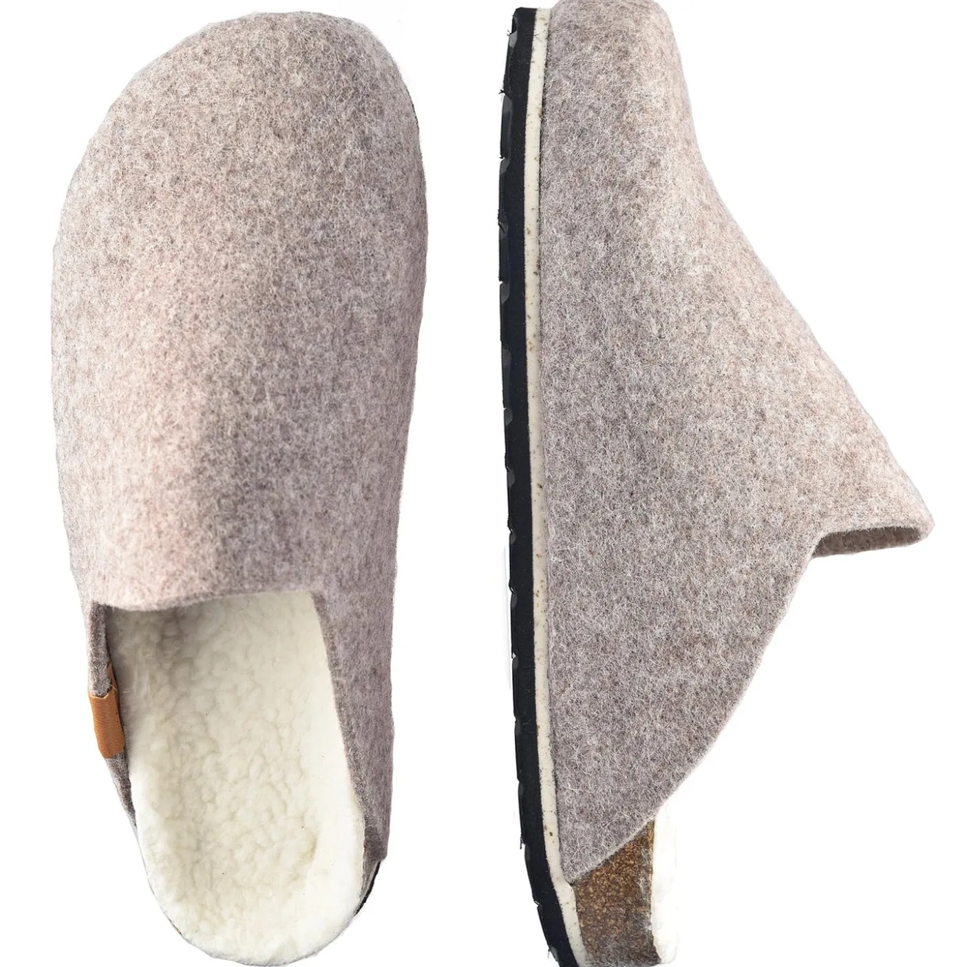 Wool felt uppers. Recycled fur insoles. Rubber and recycled cork footbed. Reclaimed wood/eva mix midsole.