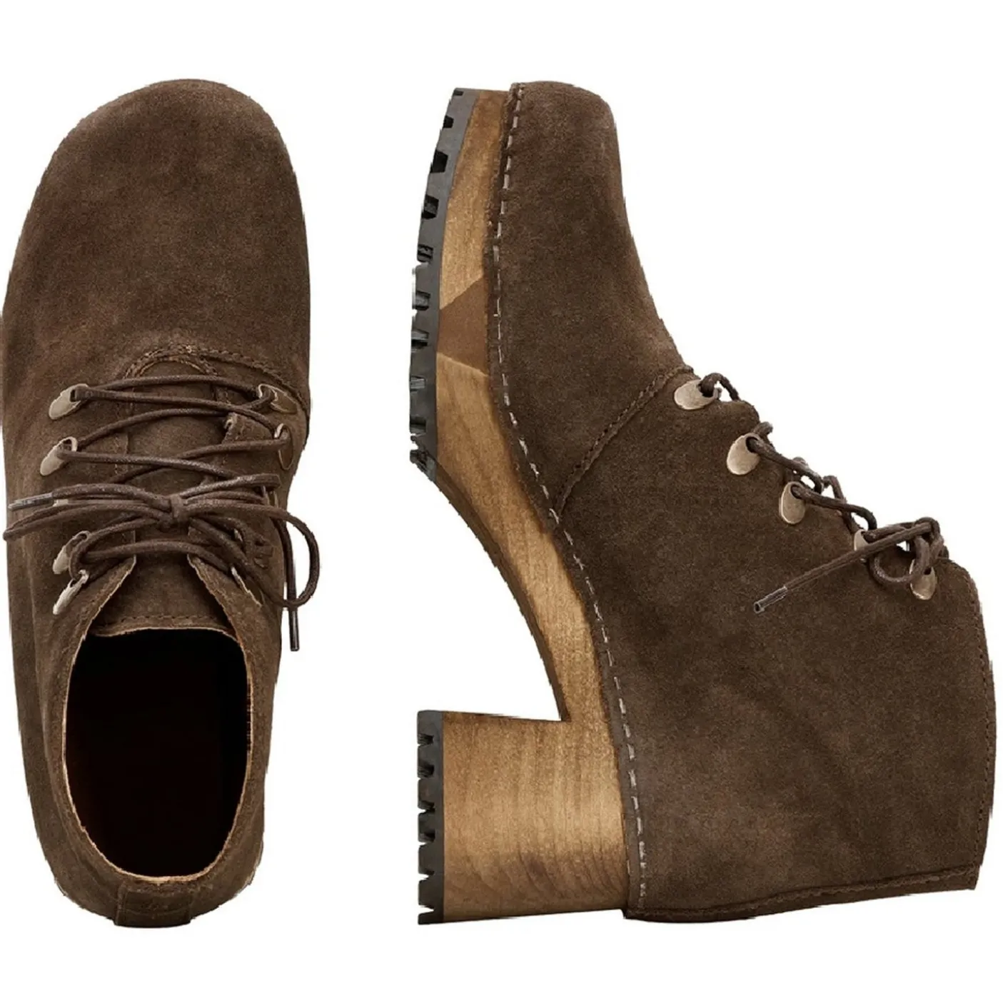 Dark brown suede leather uppers. Medium high shaft with laces. Flex lime tree wooden soles with rubber grips. From Danish makers Sanita.