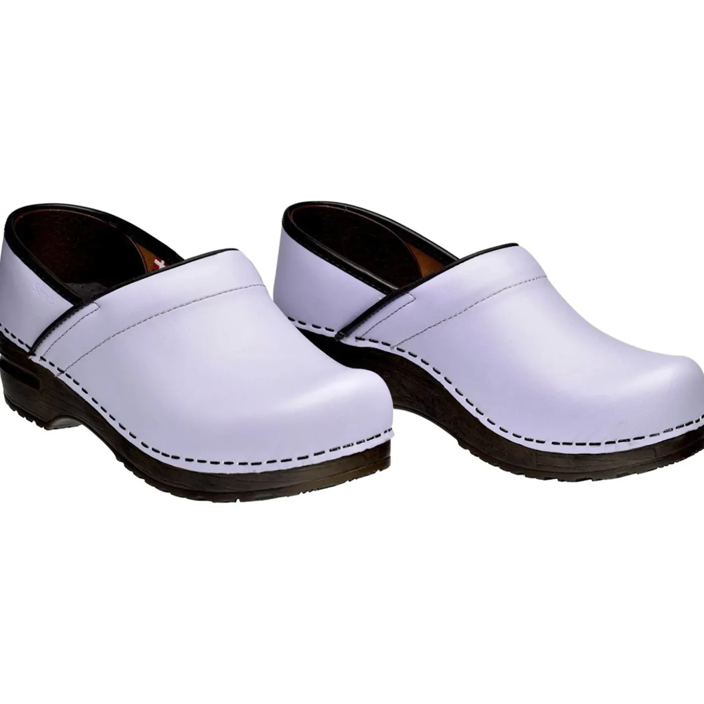 Ladies professional closed heel clogs. Smooth leather uppers in a single vibrant colour.