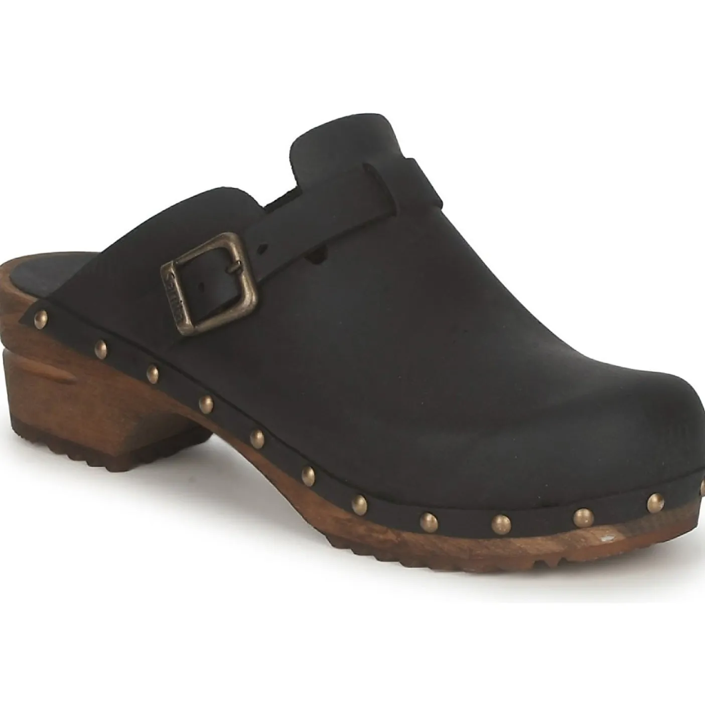 Ladies open wooden footbed clogs with adjustable brass buckle.