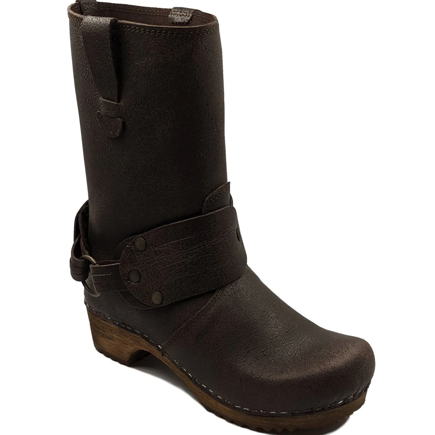 Wooden footbed clog boots with distressed dark brown real leather uppers.