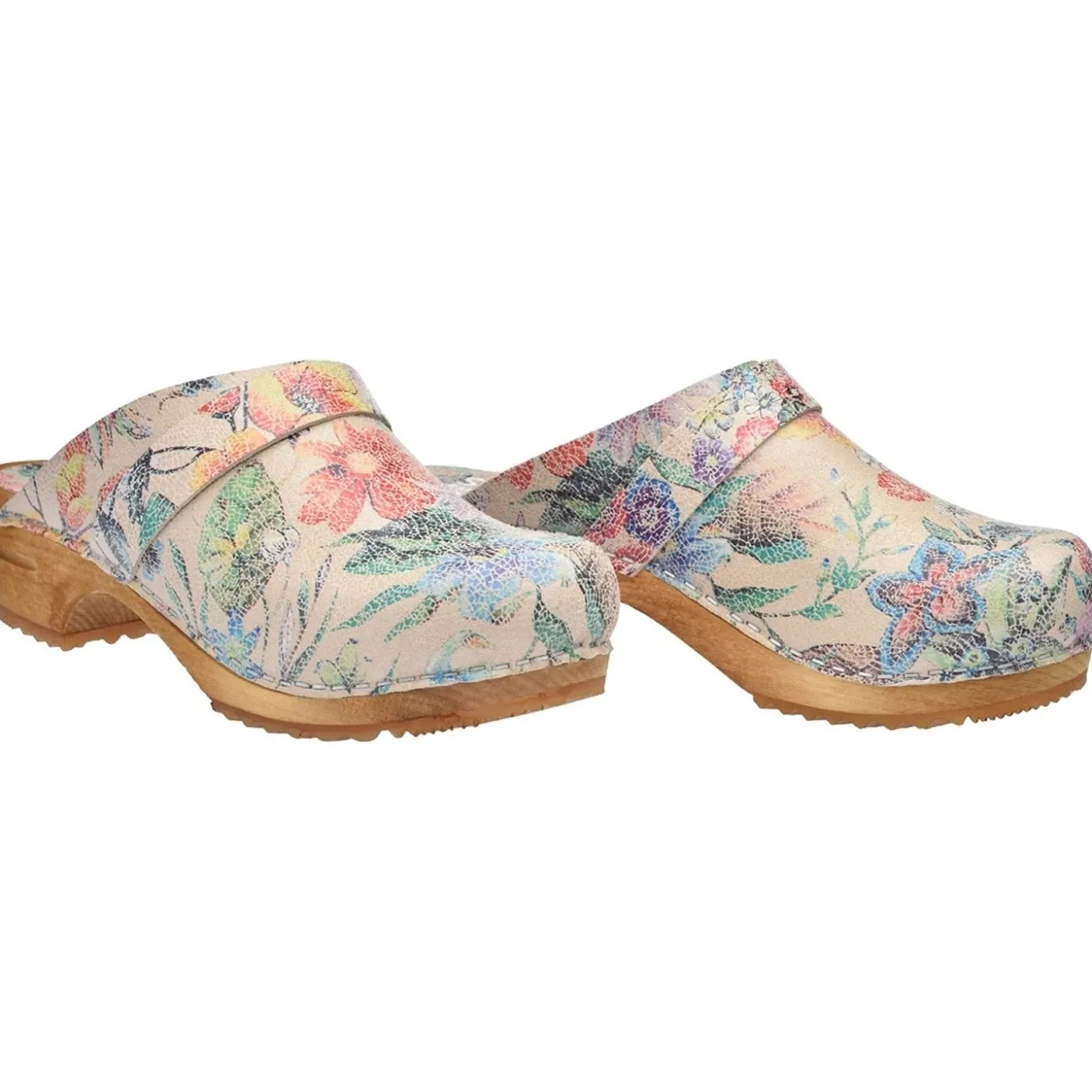 Vegan open wooden footbed clogs with printed microfibre uppers.