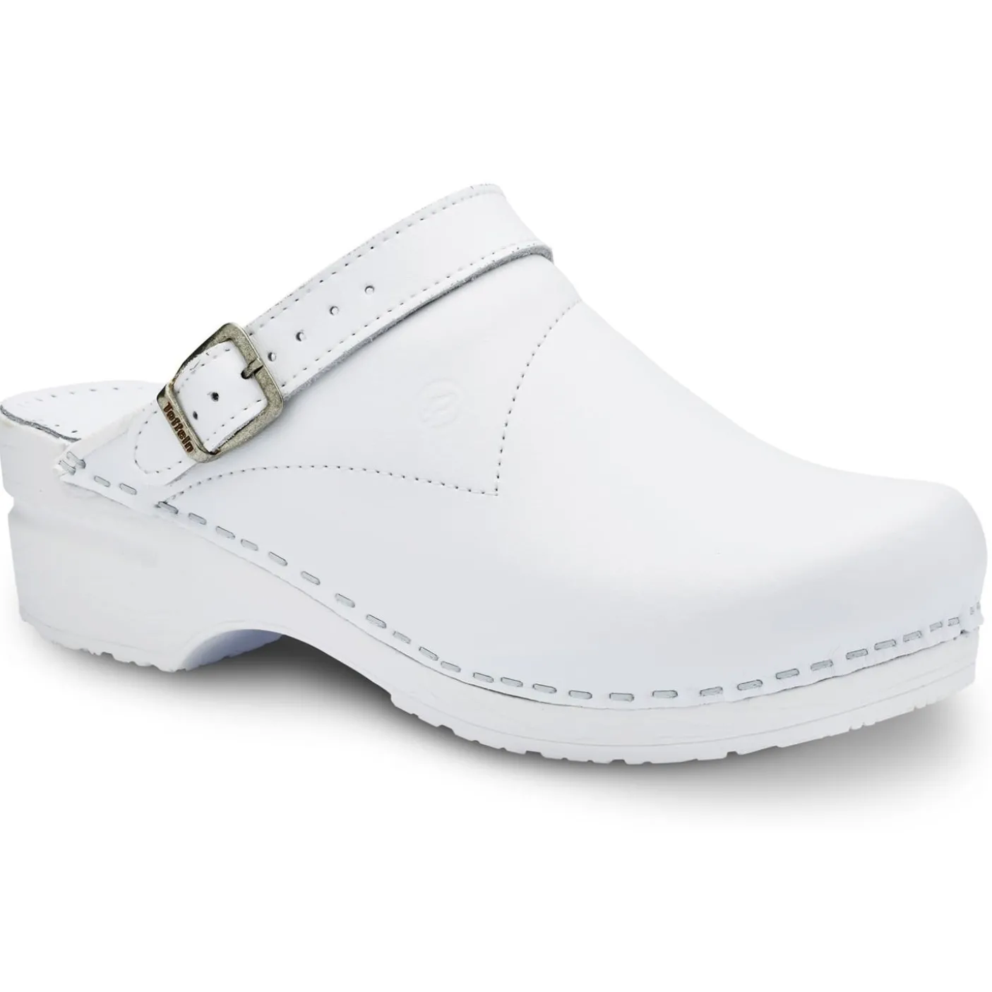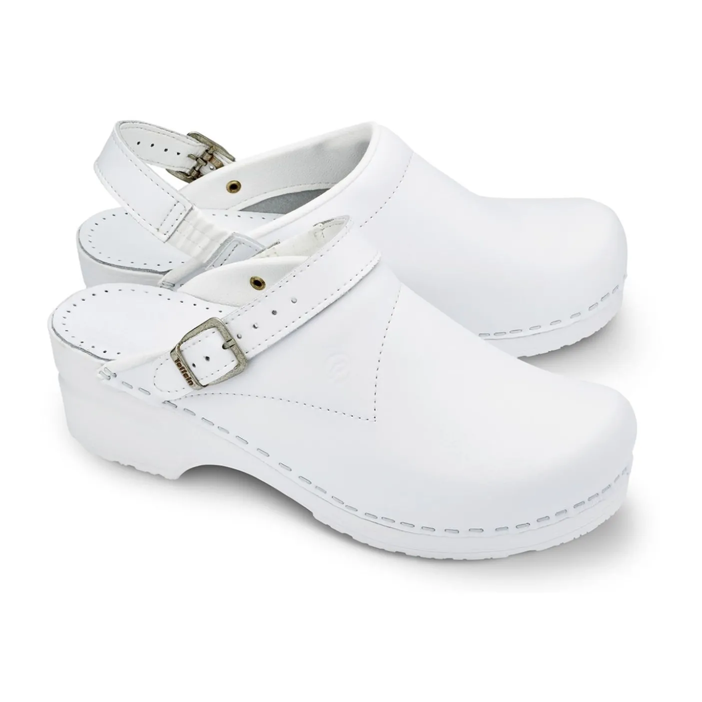 Unisex flexible arch-supporting clog with elasticated heel strap which holds the foot securely.