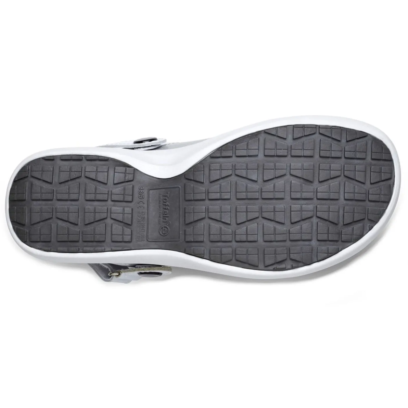 Unisex comfort shoe with adjustable heel strap and contrasting colour panel on upper.