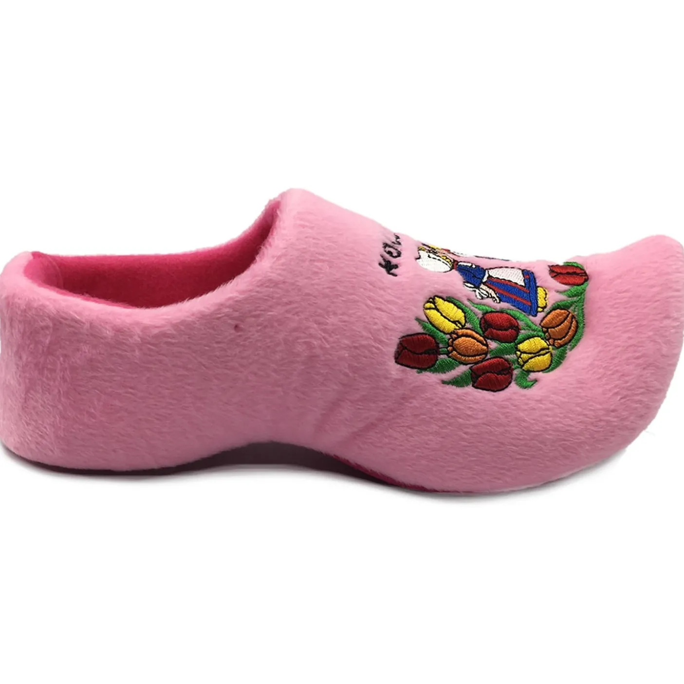 Fun Comfy Clog Slippers in Pink with embroidered ‘Kissing Couple’ design. Original Dutch clog design with slight heel and curled toe. Perfect to keep your feet warm around the house!