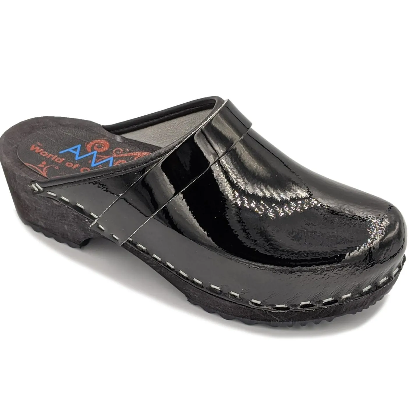 A Quality Swedish clog with stained black wooden footbed and black patent leather uppers.