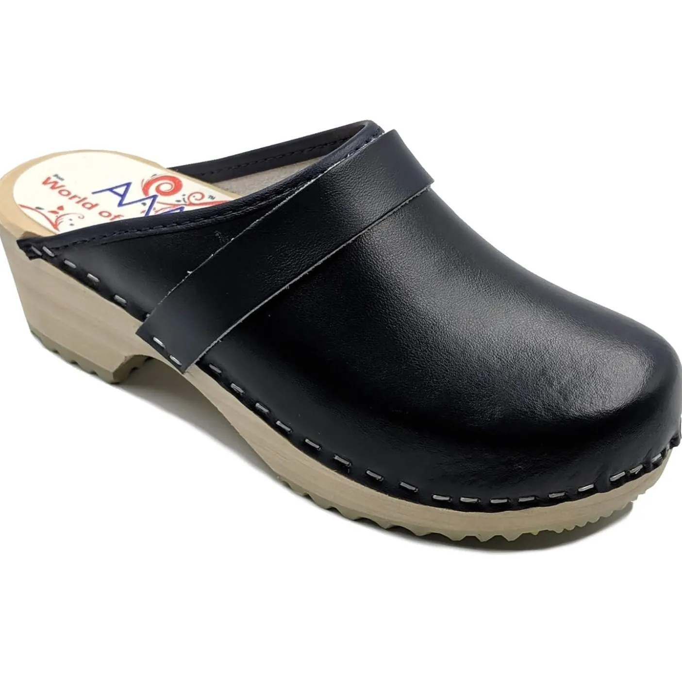 A Quality Unisex Swedish clog with natural wooden footbed, leather uppers and rubber grip sole.