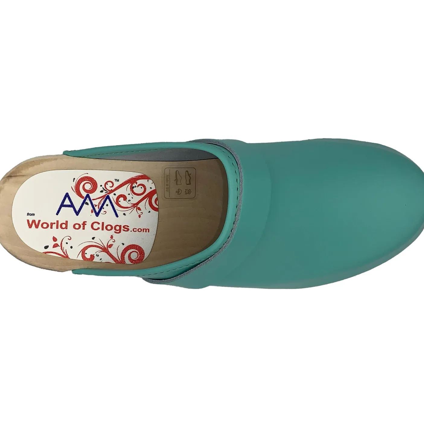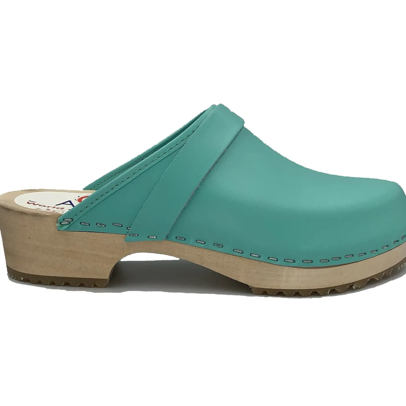 A Quality Unisex Swedish clog with natural wooden footbed, vibrant coloured leather uppers and rubber grip sole.