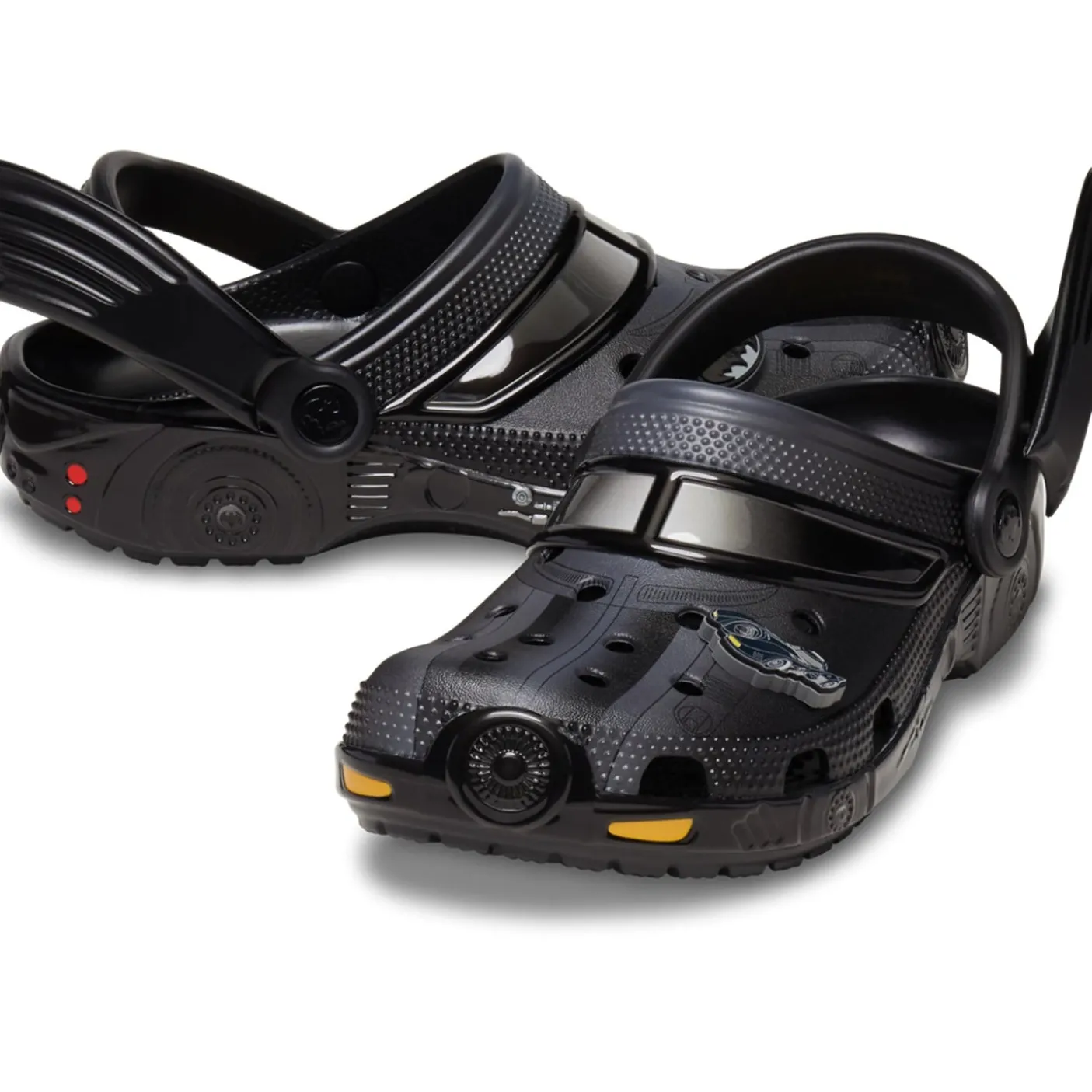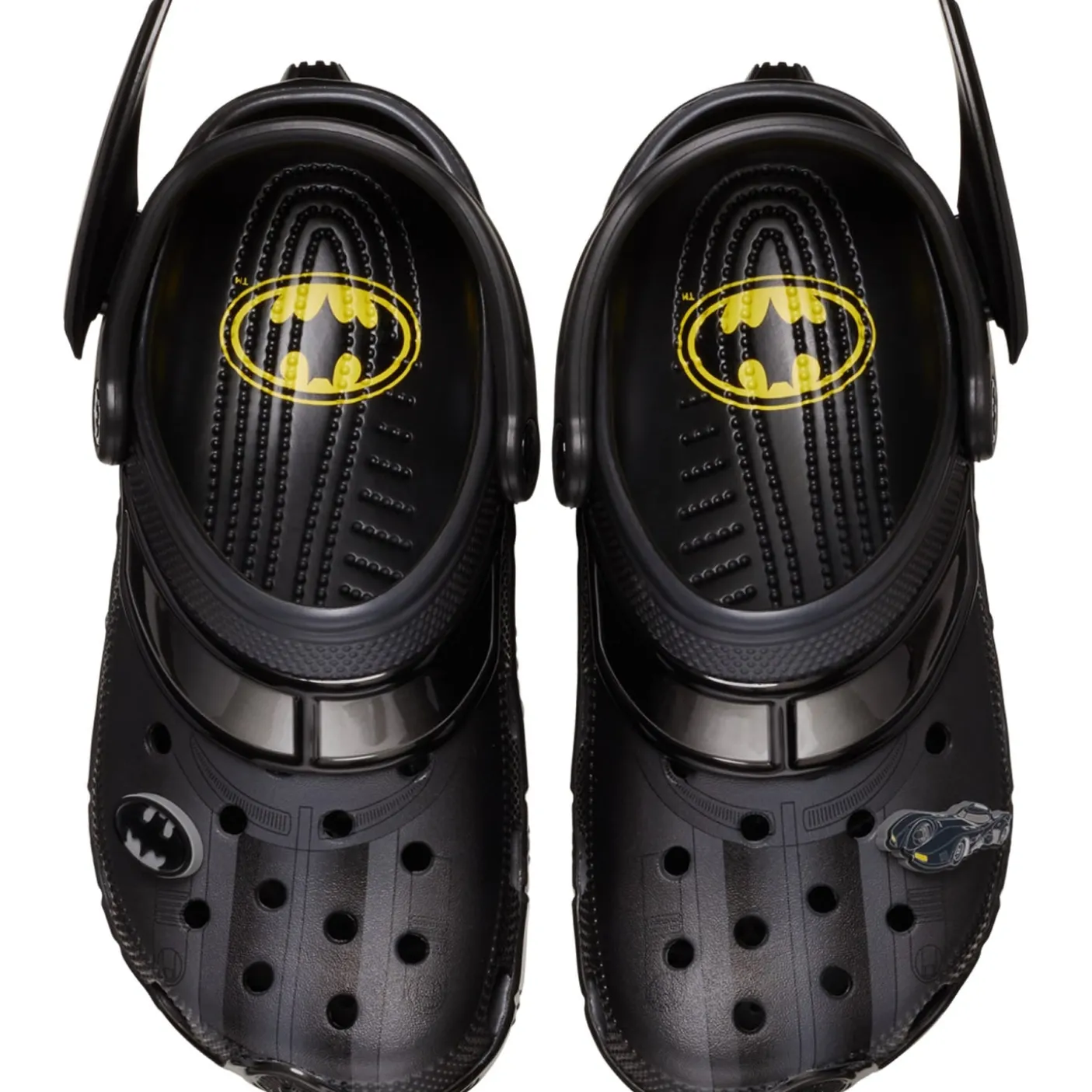 Batman! These are cool Batmobile style clogs. Classic clogs starring iconic Batman graphics from the comic and film series. Incredibly light and fun to wear. Heel strap for a more secure fit. Customisable with Jibbitz charms. Iconic Crocs Comfort cushioning.