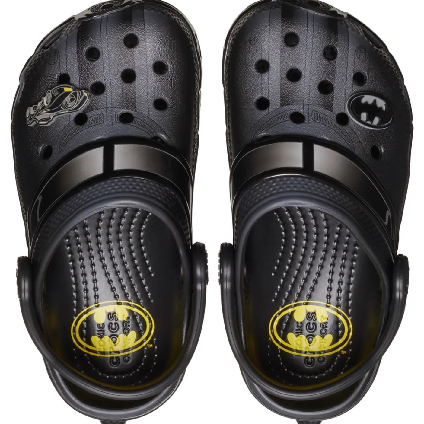 Batman! Run around with a Batmobile on your feet! Classic clogs starring iconic Batman graphics from the book and film series. Incredibly light and fun to wear. Heel strap for a more secure fit. Customisable with Jibbitz charms. Iconic Crocs Comfort cushioning.