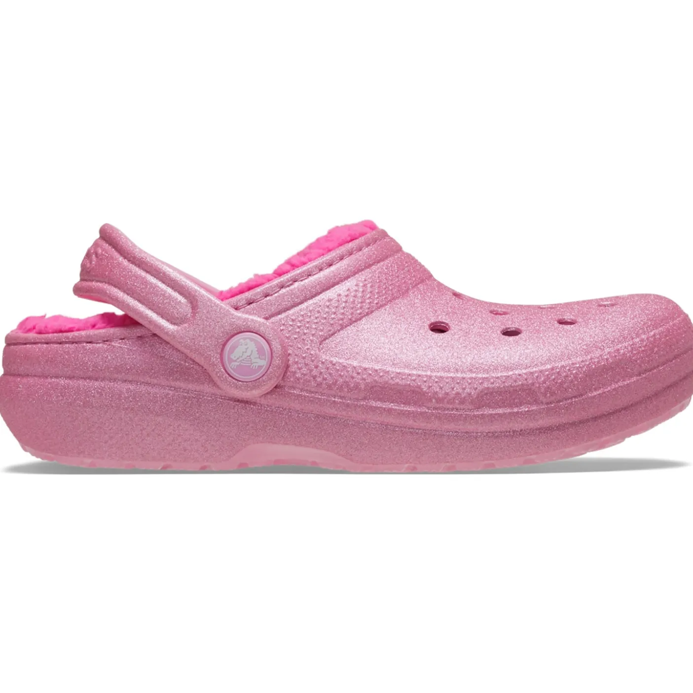 A toasty lined version of the classic clog for kids.Glittery and Pink!The legendary Classic Clog, now with a warm, fuzzy inside. Incredibly light and easy to wear. Great indoors or out. Dual Crocs Comfort, soft lining atop a Croslite foam outsole. Heel strap for a secure fit. Non-marking.