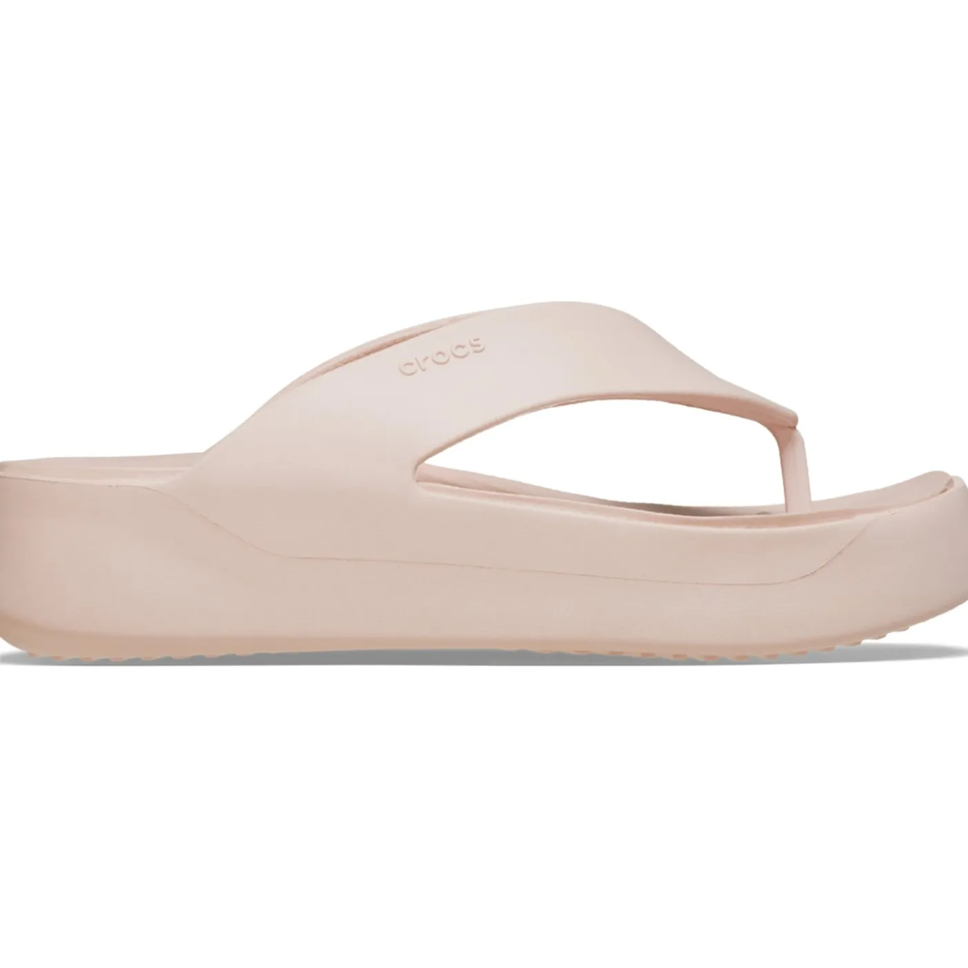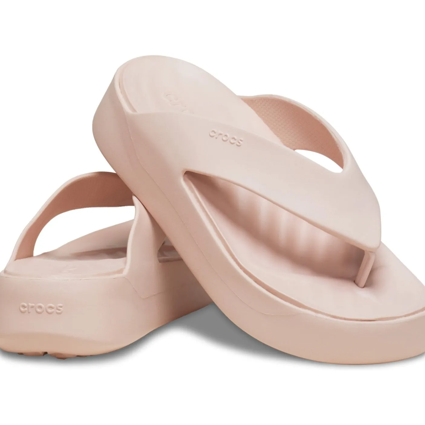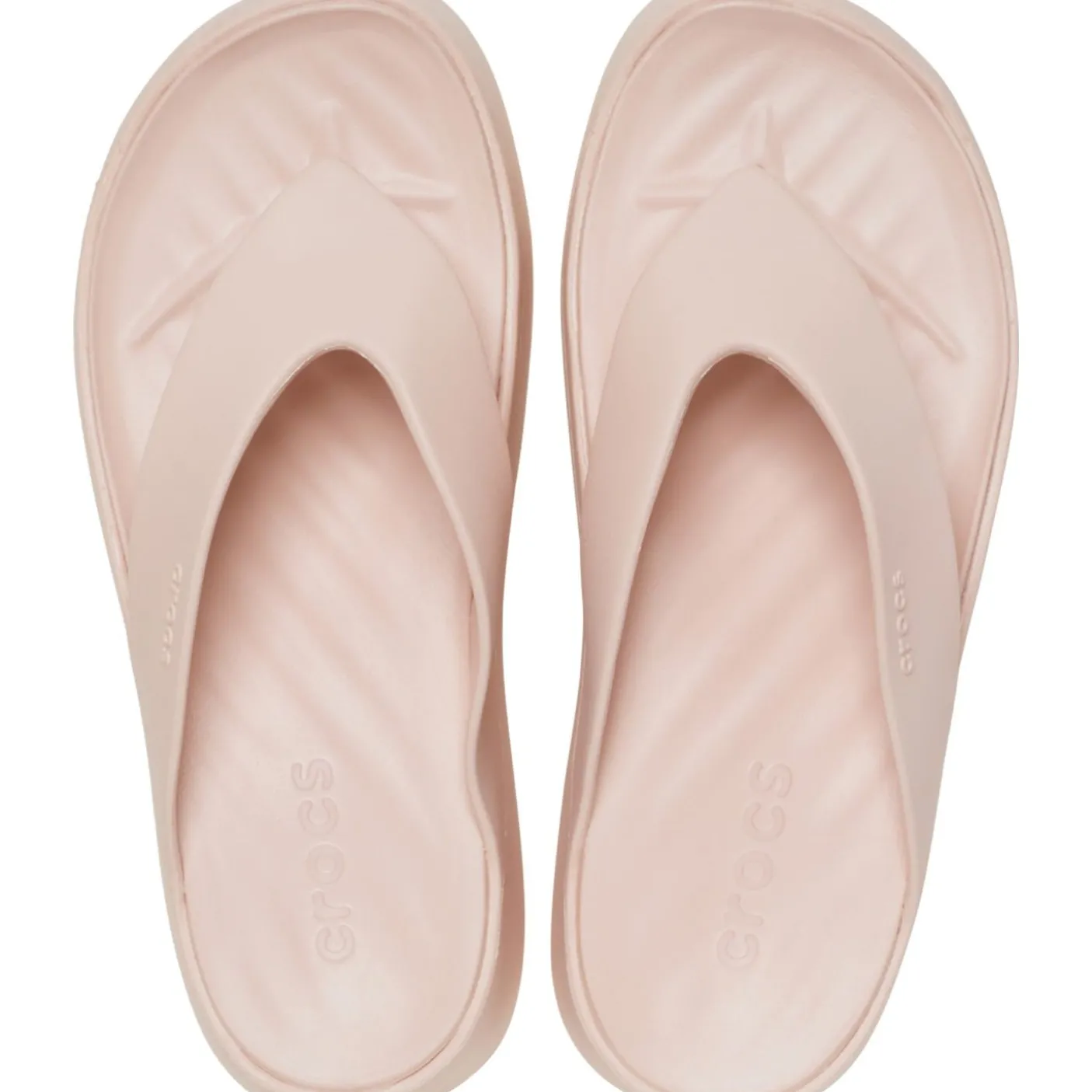 Crocs are elevating the flip-flop! The basic style every woman needs made prettier, more versatile, yet every bit as comfortable. A prettier, more feminine everyday flip. Comfortable platform height for a little lift without heels. Incredibly light and versatile; for beach, pool, travel and beyond. Iconic Crocs comfort original Croslite foam cushion.