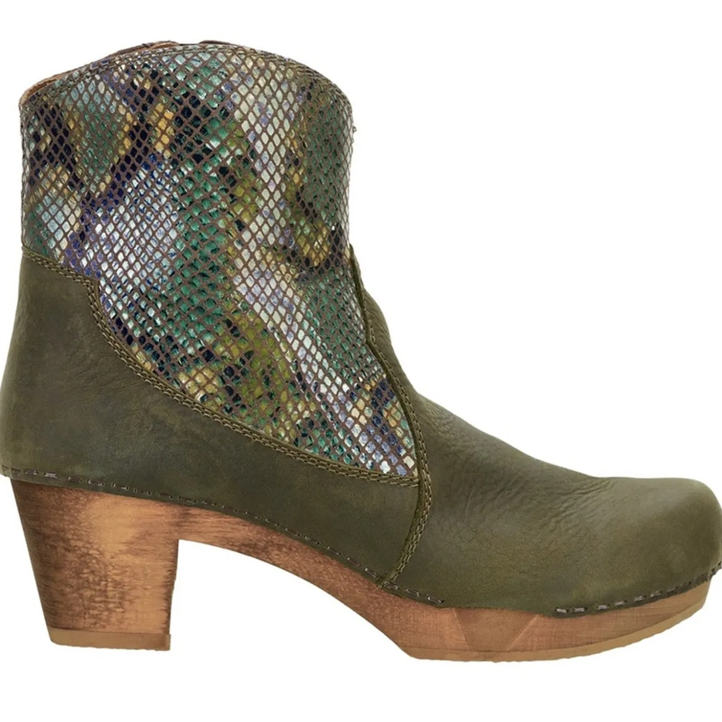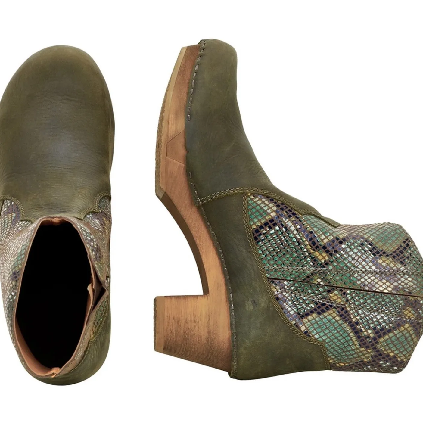Wooden flex footbed clog boots with snake printed oil leather uppers.