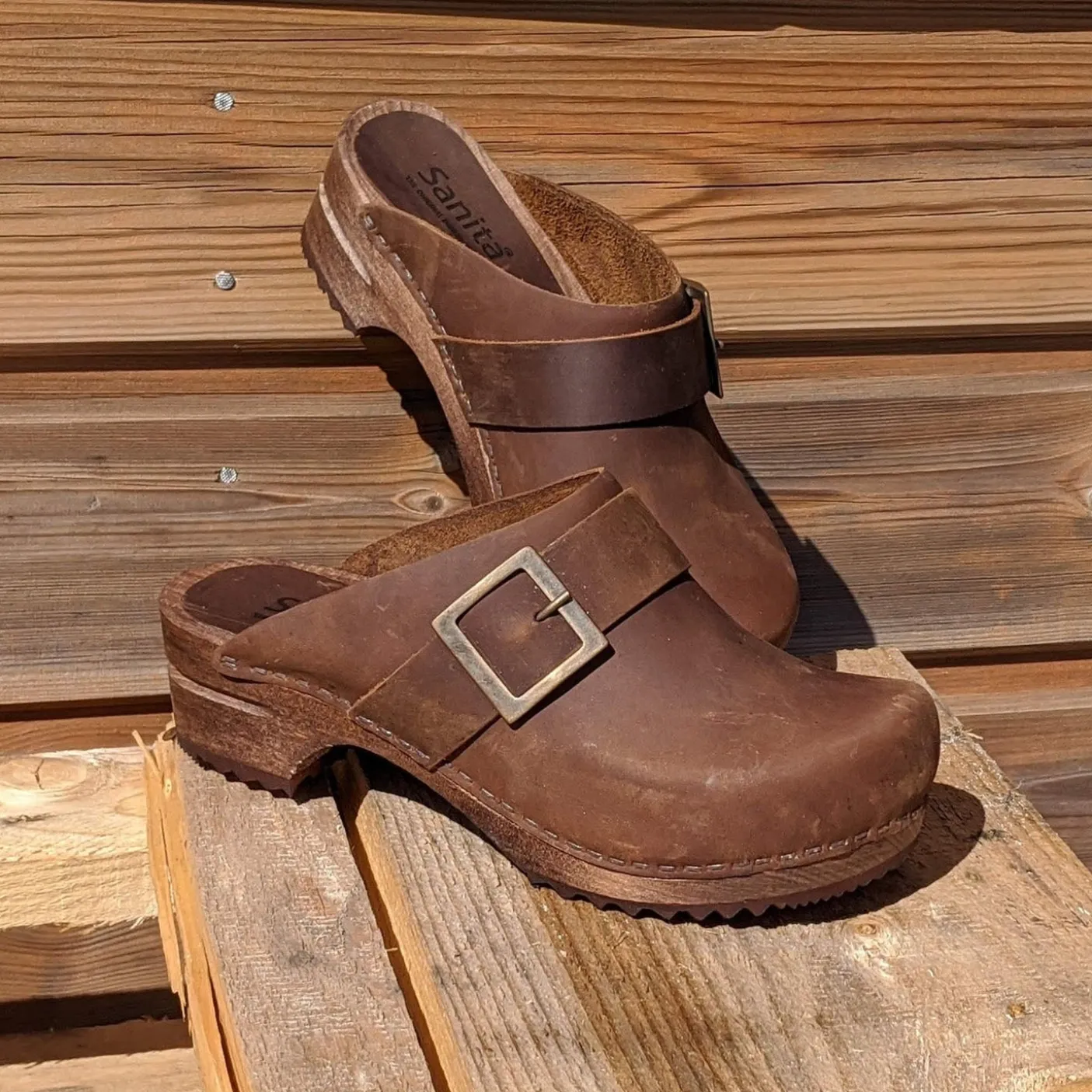 Stained antique brown footbeds. Dark leather uppers. Thick grippy soles. From Danish makers Sanita.
