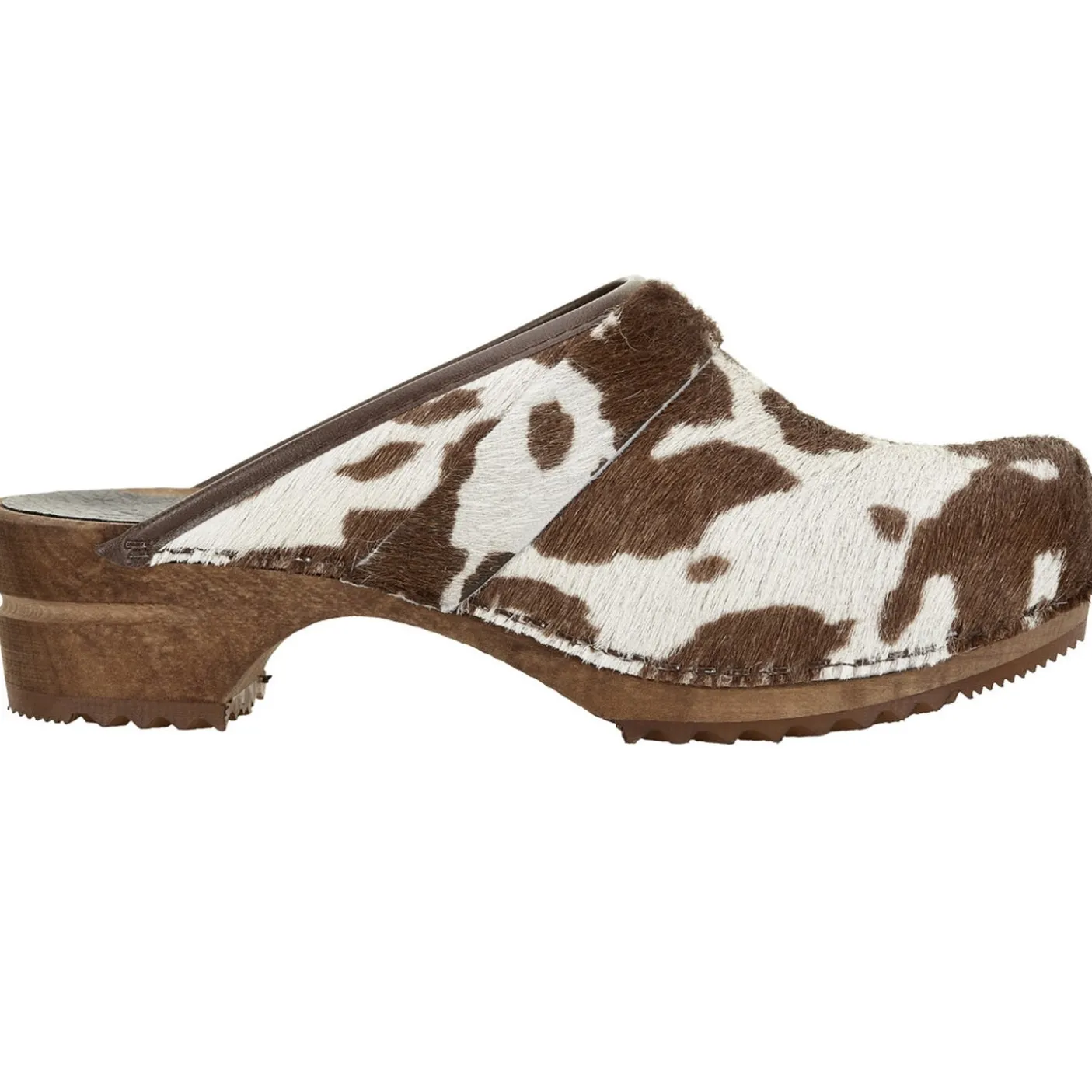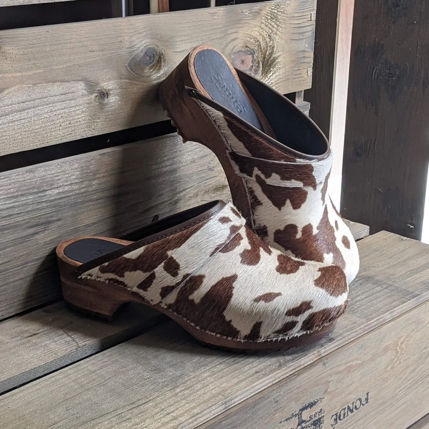 Ladies open wooden footbed clogs with brown cow print leather upper.
