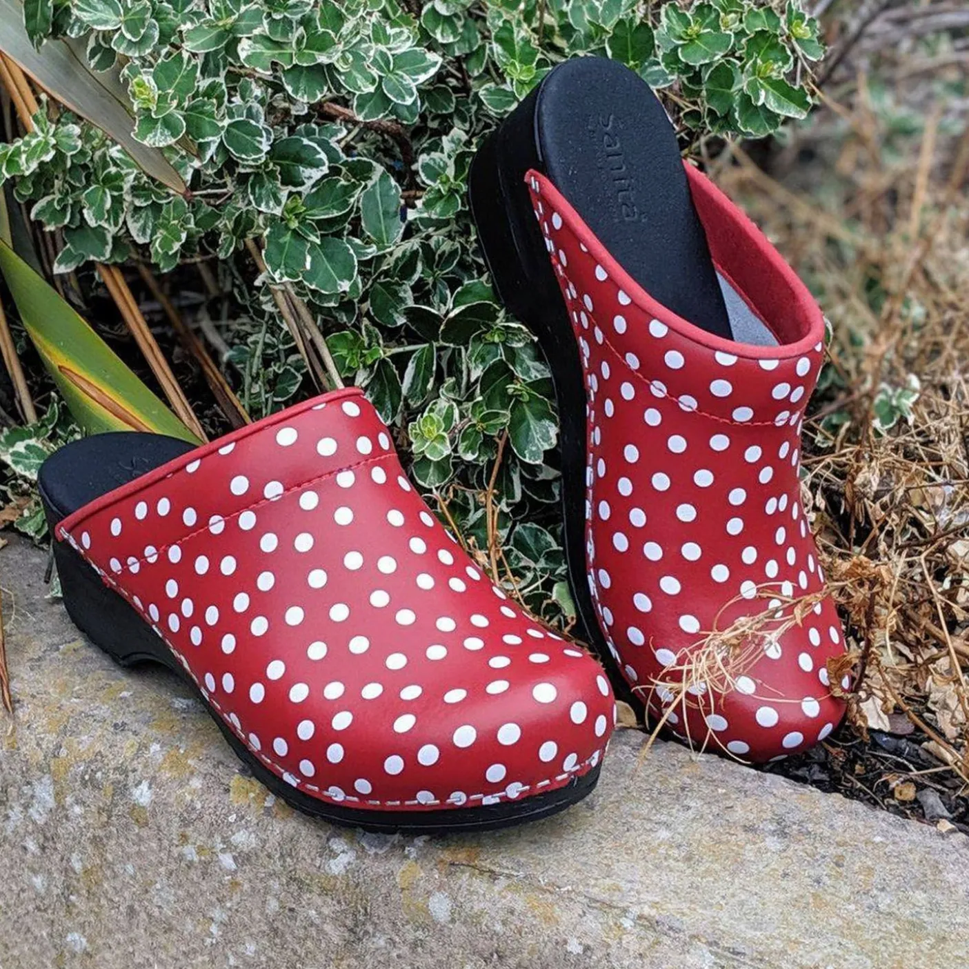 Ladies open flexible clogs with fun spotty wipe-clean leather uppers.