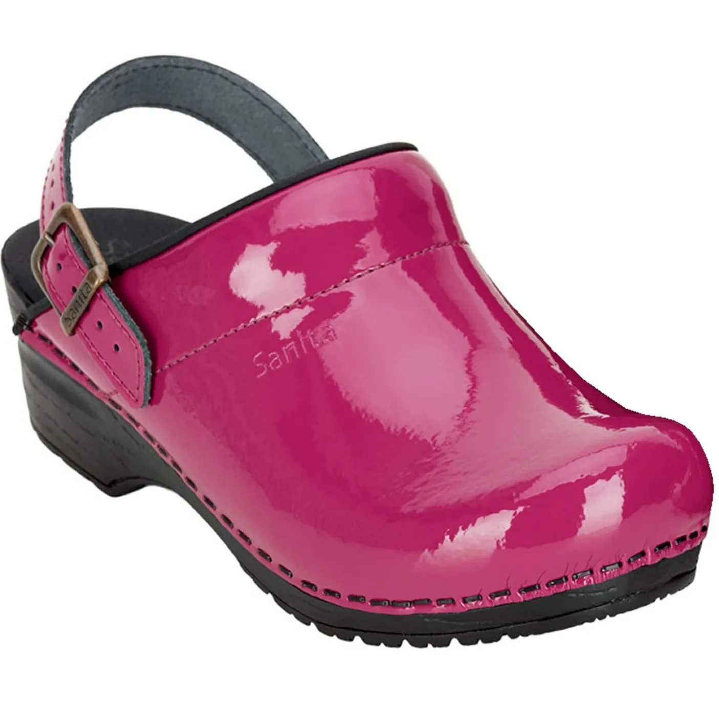 Ladies open flexible clogs with bright patent leather uppers and adjustable heel strap.