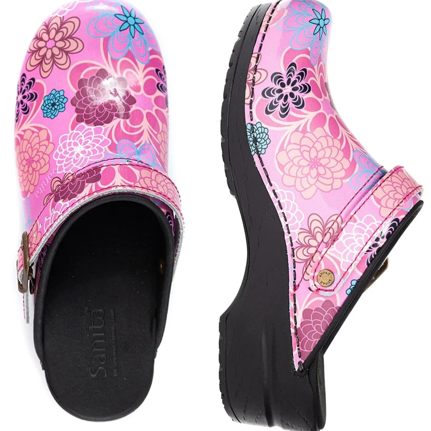 Ladies open flexible clogs with patent leather uppers and adjustable heel strap.
