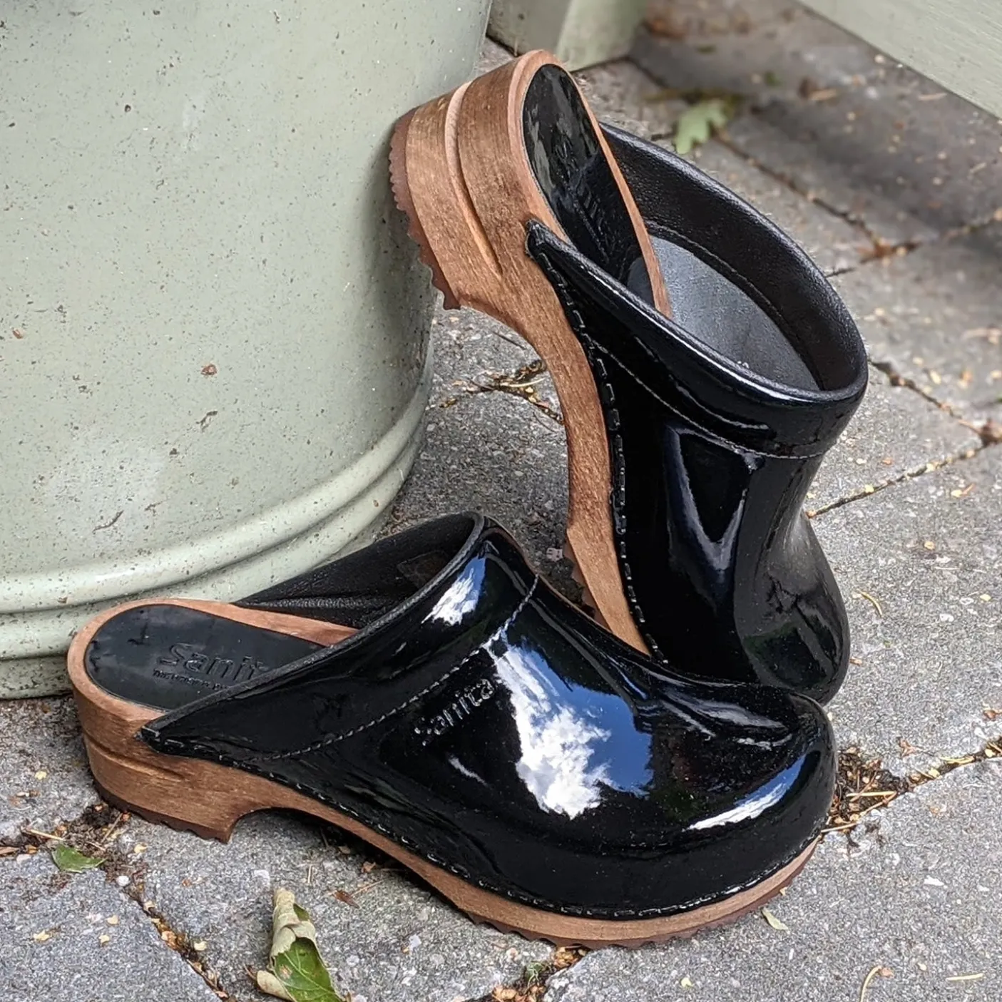 Ladies open wooden footbed clogs with classic patent leather uppers.