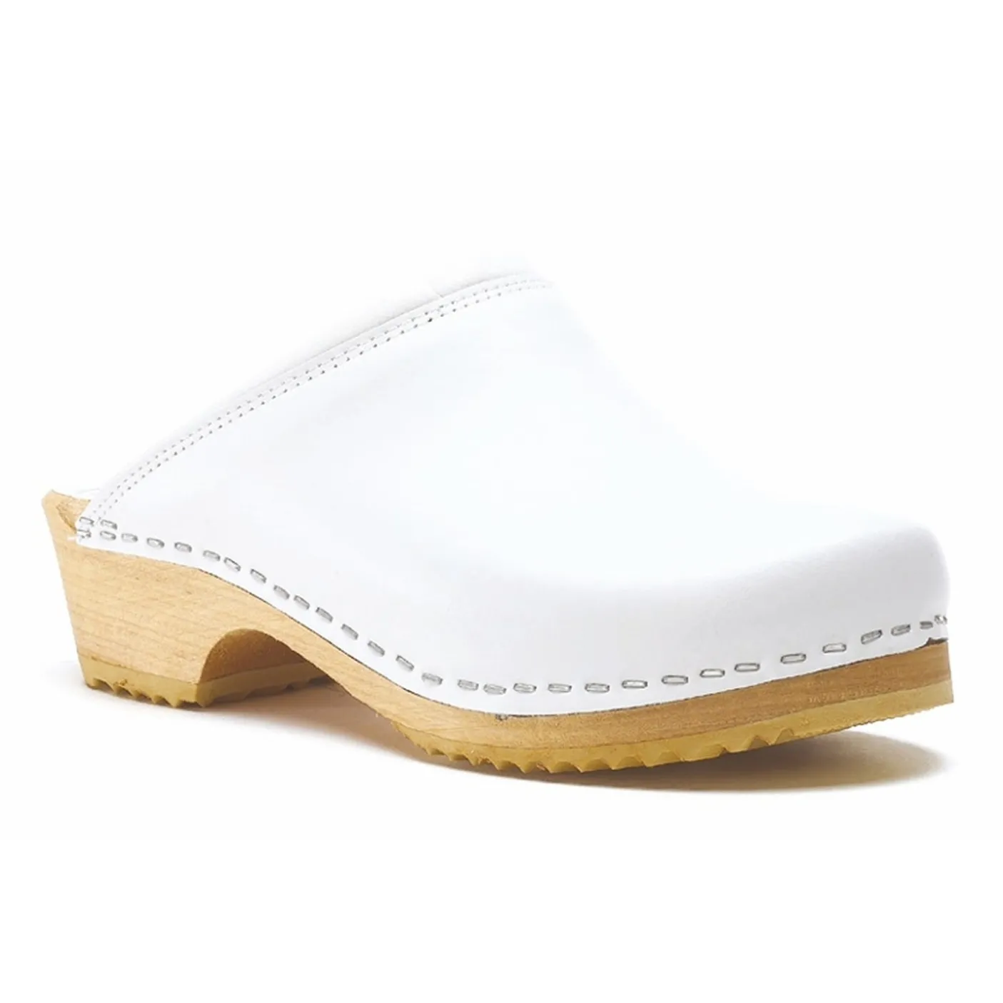 Unisex white wooden footbed clog with padded instep.