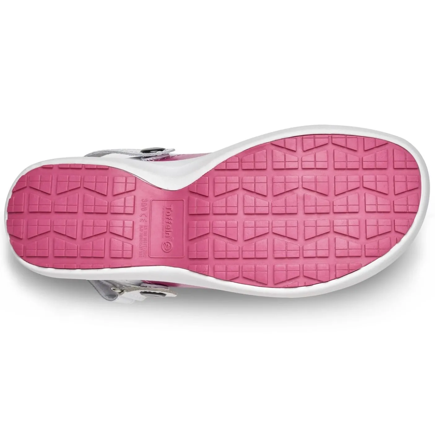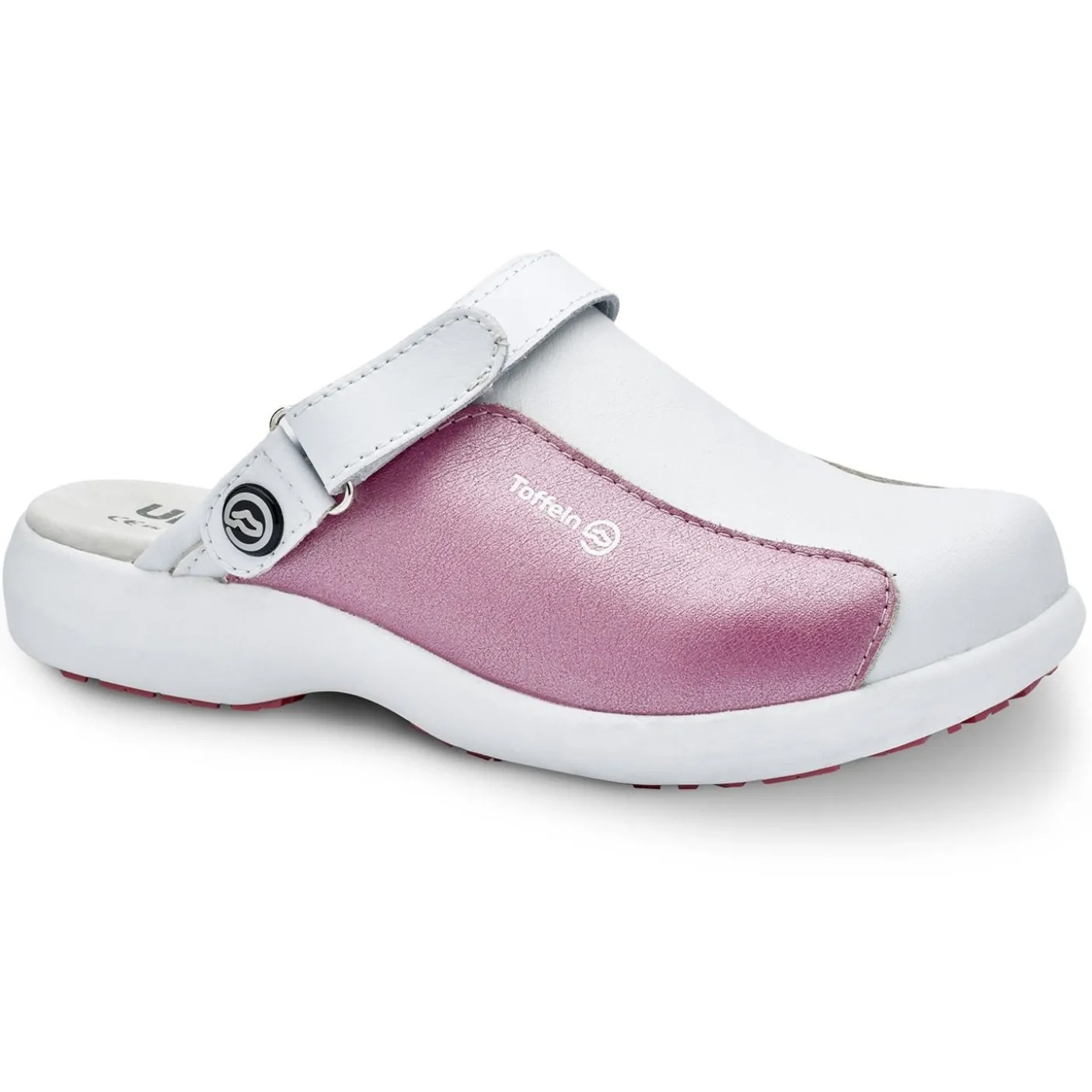 Unisex comfort shoe with adjustable heel strap and contrasting colour panel on upper.