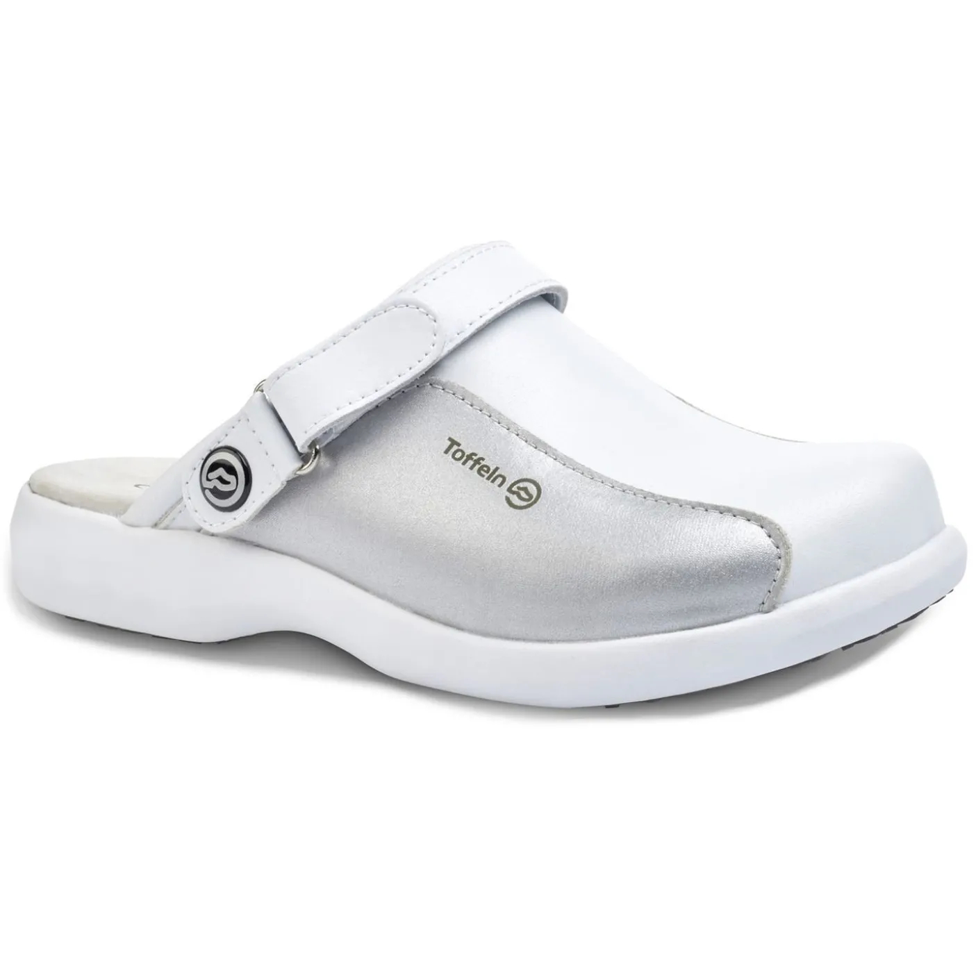 Unisex comfort shoe with adjustable heel strap and contrasting colour panel on upper.